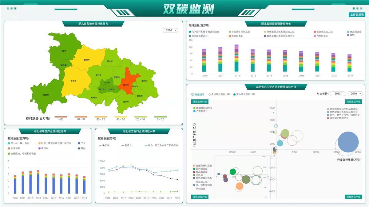 该产品将省内重点行业的碳排放量与产值关联,构建产业产值—碳排放四象限评价体系,按照增产降碳、减(稳)产降碳、增产增碳和减产增碳进行归类,为推动各行业低碳转型提供直观量化的分析工具,为公司跟踪监测碳排放和政府制定减碳政策提供参考,也为湖北绿色低碳转型、加快实现“双碳”目标提供了有力的分析工具。