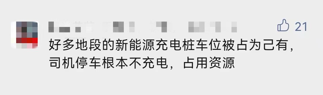还有网友表示,部分地段的新能源充电桩被占为己有,司机停车不充电,还占用了资源。