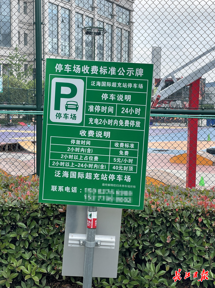 泛海生活广场旁的蔚来充电站停车收费公示牌上,标注充电2小时内不收停车费,超时则照实收费。记者杨荣峰 摄