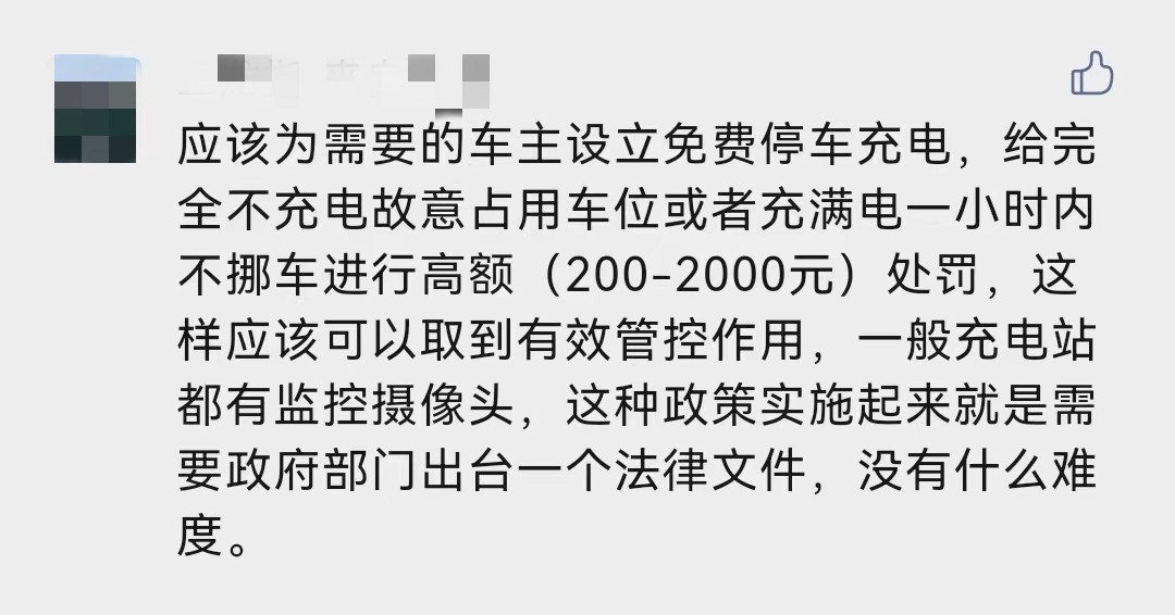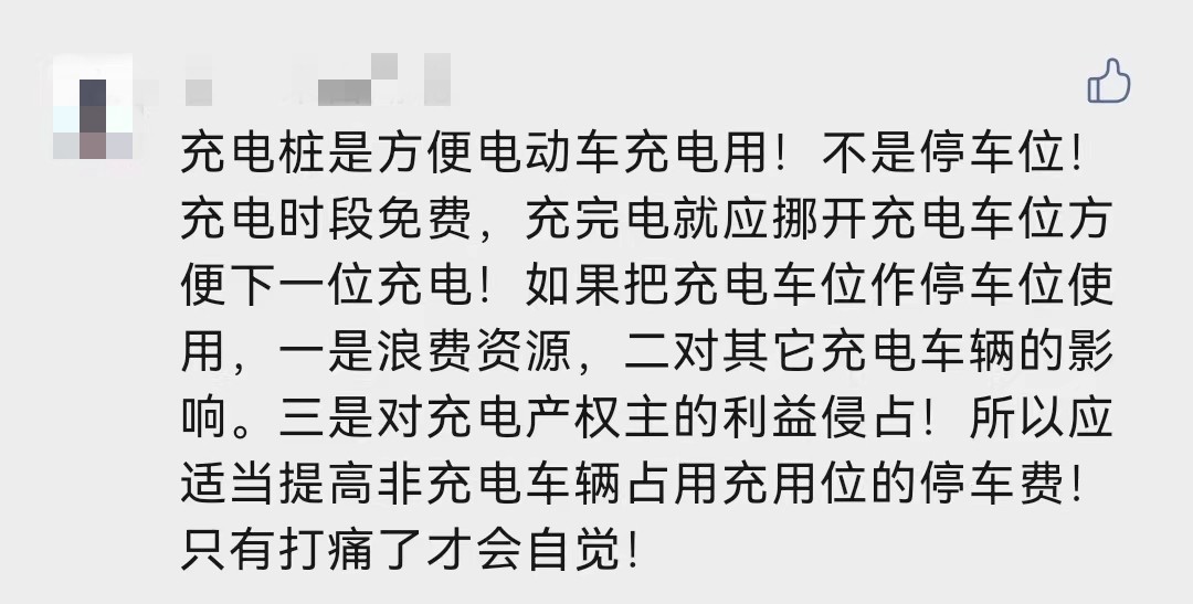 有网友提出建议说,为需要的车主免费停车充电,不充电故意占用车位的应该进行处罚。