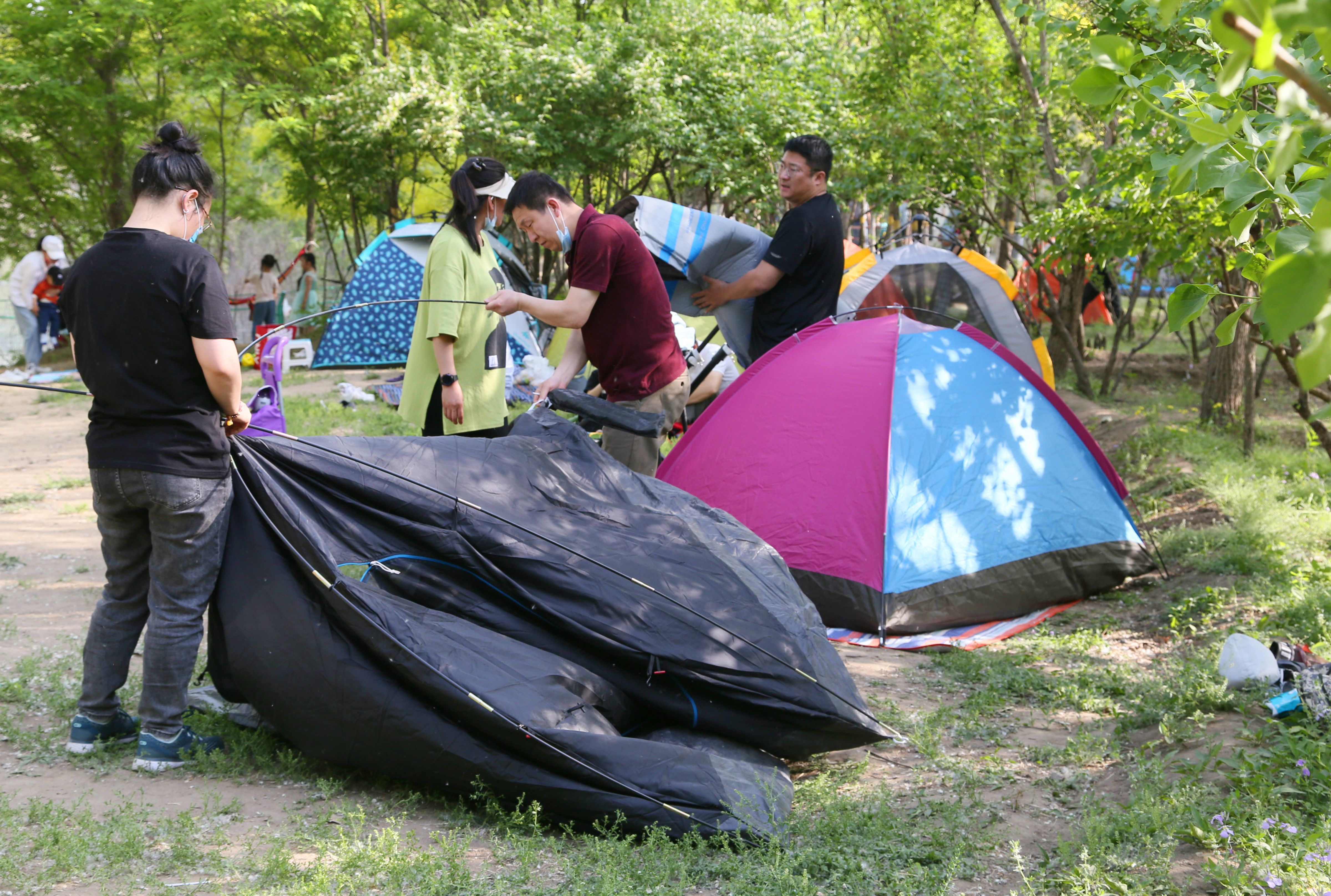 ▲2022年5月4日,游客在北京顺义奥林匹克水上公园搭帐篷享受假期美好时光。露营成了这个五一假期颇受青睐的一种出游方式。图/IC photo
