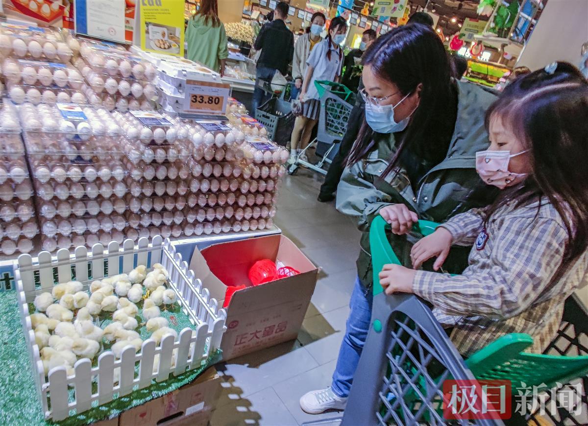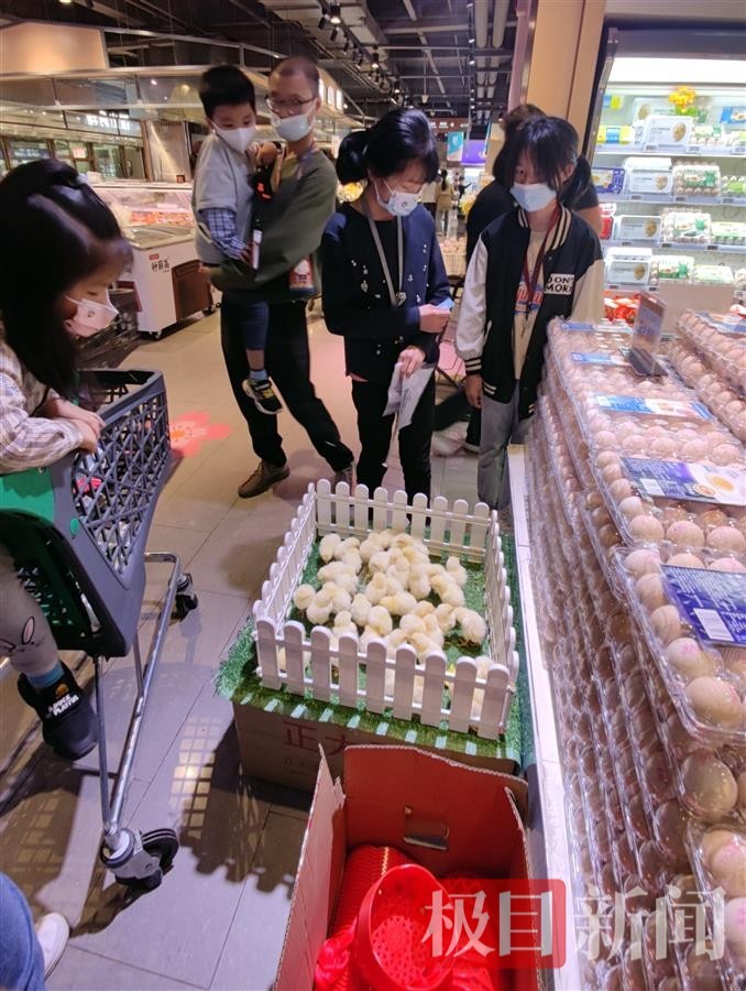 在现场,带着小孩逛到该售卖点的家长基本上都会停留一会儿,满足孩子的童心,不少家长为了孩子能得到小鸡而买了鸡蛋。