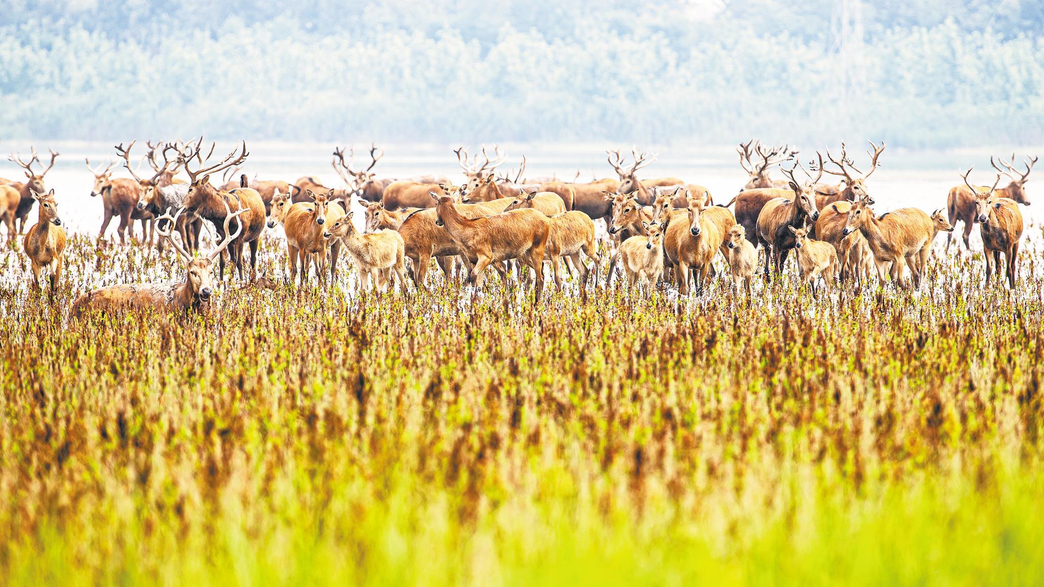 6月8日,麋鹿大家庭在石首天鹅洲滩涂上悠闲地生活。得益于有效的保护与建设,近年来石首麋鹿国家级自然保护区内的麋鹿以平均每年200余头的数量增长。(湖北日报全媒记者 梅涛 通讯员 杨涛 摄)