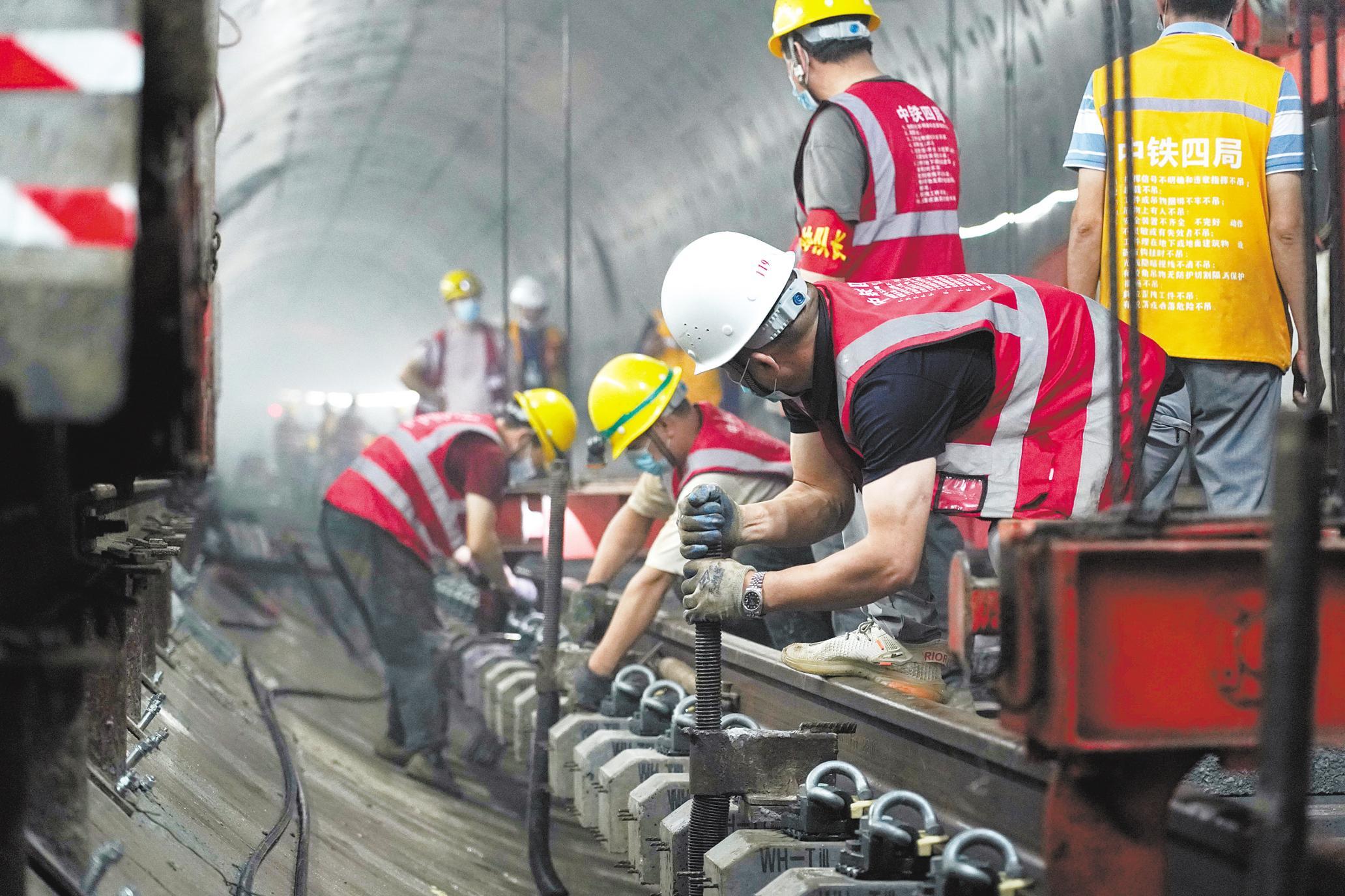 6月20日,在武汉地铁前川线腾龙大道-巨龙大道区间,施工人员正在铺设最后一组轨排。当日,前川线一期实现全线“轨通”。武汉地铁前川线工程分两期建设,建成后,将黄陂前川街和盘龙城、东西湖片区连成一个整体,提升天河机场枢纽集散能力,助力武汉北部建设发展。