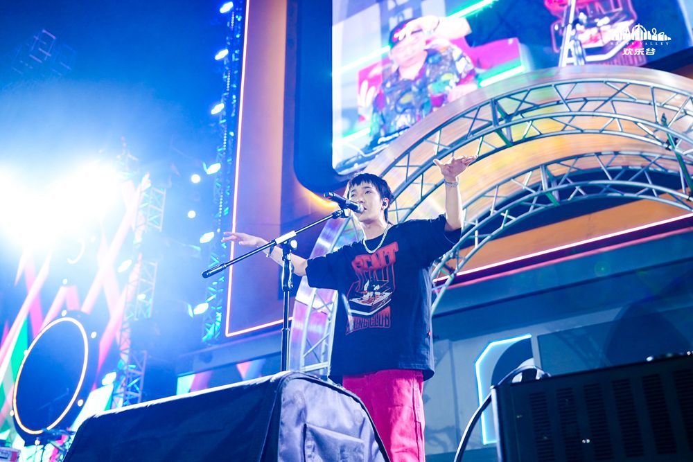 晚上7点,全园屏息以待,巨型复古影碟机造型的主舞台开启炫酷灯光秀,夏日迪斯科派对氛围感拉满,伴随着一阵欢呼和尖叫,演员、风格多样的音乐制作人和说唱歌手Tizzy T出场,为现场游客带来精彩演唱,《少数派报告》《头文字T》《Party是我家》等多首热门单曲连唱,精彩现场LIVE让游客跟随音乐一起摇摆。