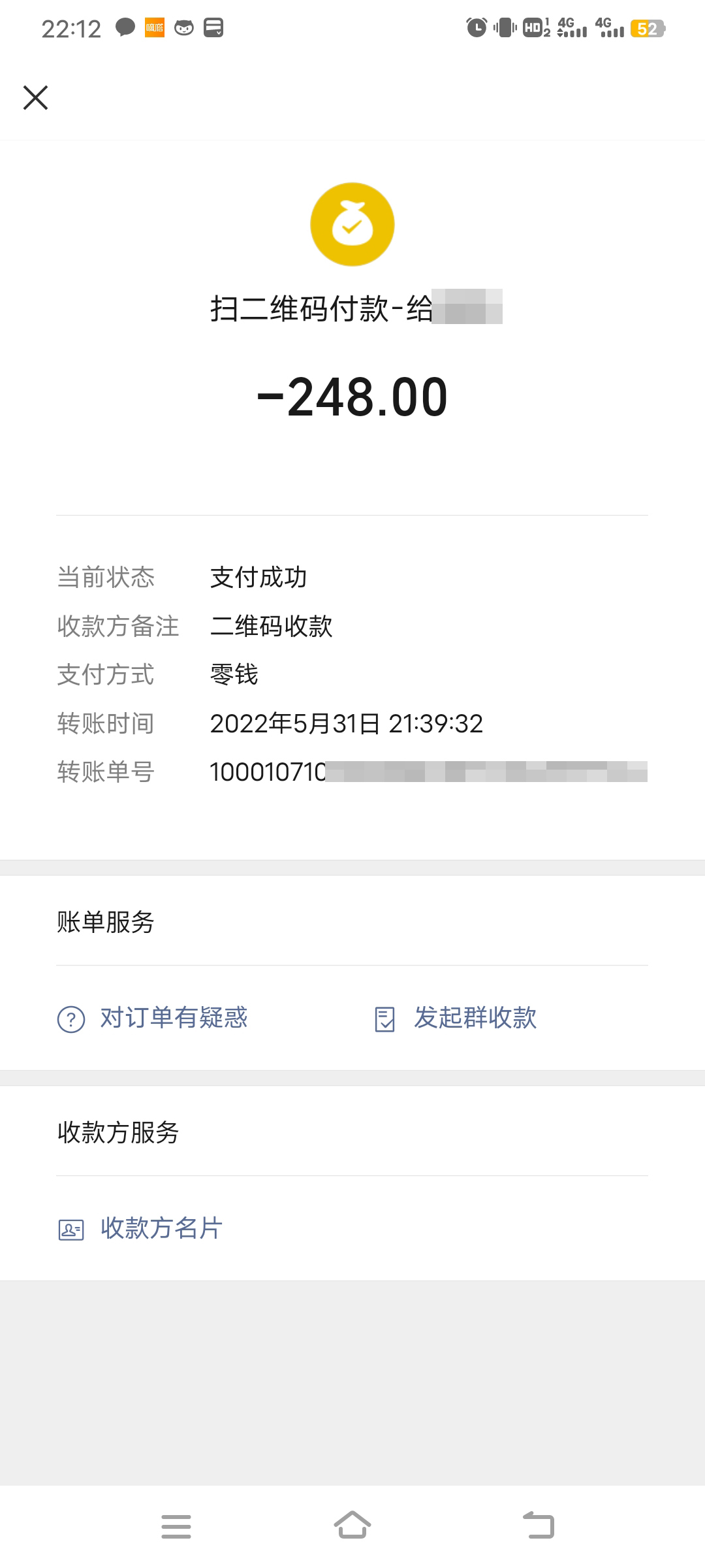 记者从李先生提供的支付记录截图上看到,这笔订单的收款方是个人,转账是时间是5月31日晚九点半左右,订单价格248元。