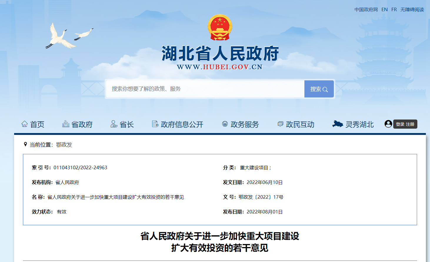 近日,长江云头条记者从湖北省人民政府官网获悉,为加快推进一批重大基础设施项目建设,积极扩大有效投资,充分发挥投资对稳定经济增长、优化经济结构的关键作用,省人民政府结合我省实际,印发了《进一步加快重大项目建设扩大有效投资的若干意见》。