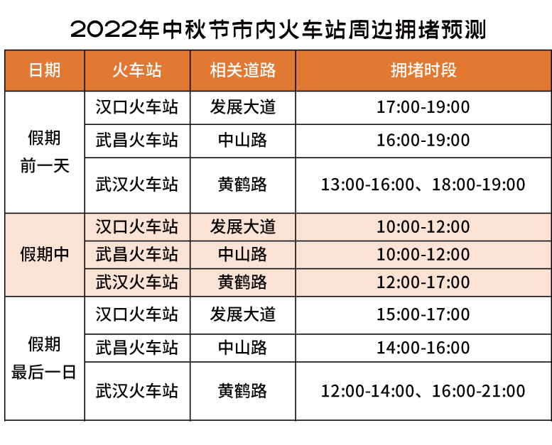 此外,全市多数高校于9月份陆续开学,其中武汉纺织大学(阳光校区、南湖校区)、武汉工商学院、湖北第二师范学院等部分高校在中秋节假期中迎接新生,主要集中在洪山区、东湖高新区及江夏区。预计三大火车站的学生流、送学家长将会增多,三大火车站日均客流量将比清明节和“五一”有所增加。