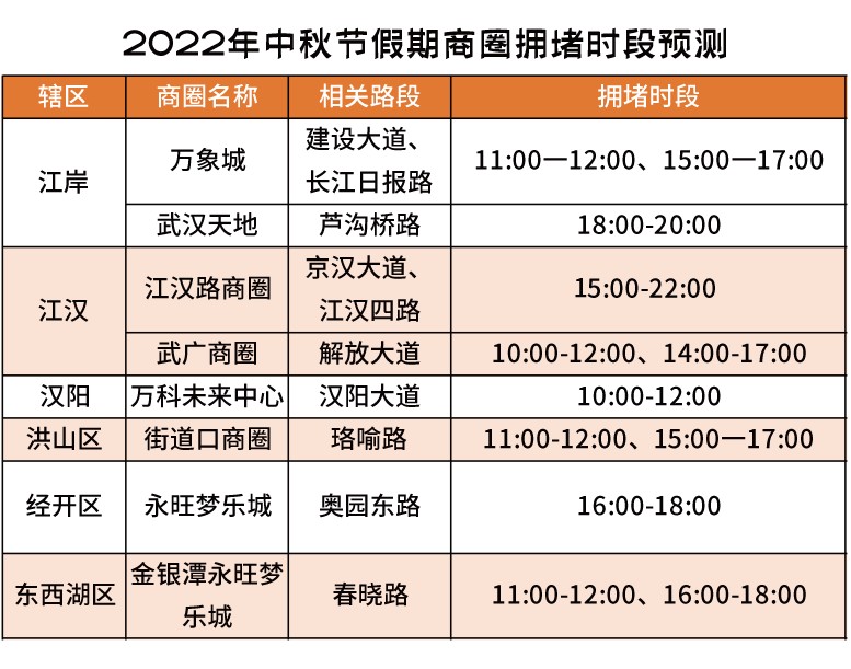 今年中秋节假期与教师节重叠,市内部分大型商场将会举办较大的节日促销活动,且第二轮“惠购湖北”消费券已于9月6日晚发放,预计假期中消费人群将有所增加,因前往商场车流较为聚集,预计部分商场进出口通道附近出现多次短时排队现象。