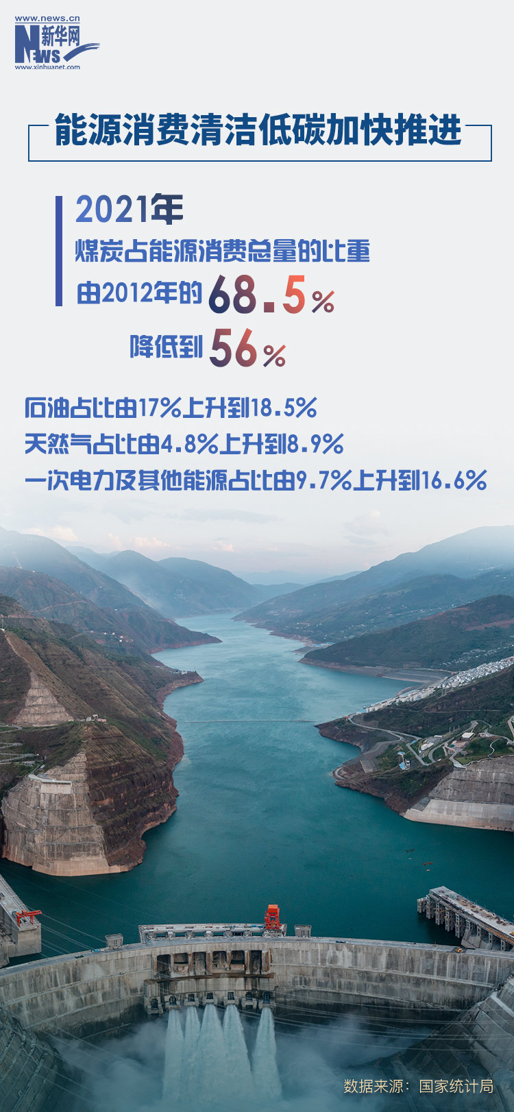 能源消费清洁低碳加快推进。2021年,煤炭占能源消费总量的比重由2012年的68.5%降低到56%,下降12.5个百分点;石油占比由17%上升到18.5%,提高1.5个百分点;天然气占比由4.8%上升到8.9%,提高4.1个百分点;一次电力及其他能源占比由9.7%上升到16.6%,提高6.9个百分点。