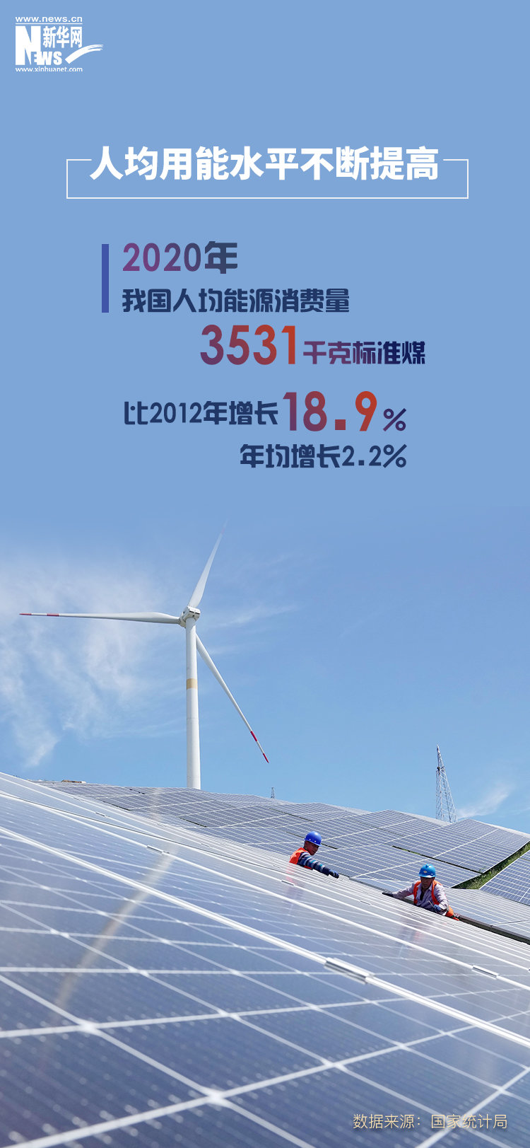 人均用能水平不断提高。2020年,我国人均能源消费量3531千克标准煤,比2012年增长18.9%,年均增长2.2%。民生用能保障有力。2020年,我国人均生活用能456千克标准煤,比2012年增长46.2%,年均增长4.9%;人均生活电力消费量年均增长7.3%,人均生活天然气消费量年均增长8.1%。