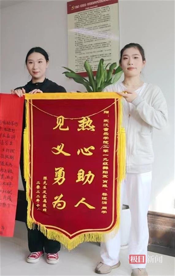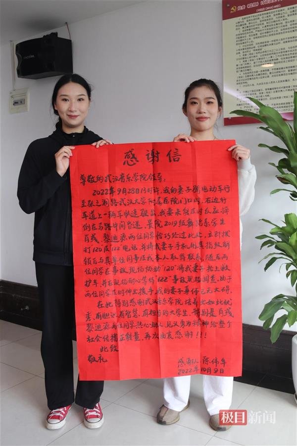 “肖彧、黎迪源两位同学热心助人、见义勇为的精神给社会传播了正能量,再次由衷感谢!”10月10日,武汉音乐学院收到市民陈先生送来的锦旗和一封手写感谢信,感谢该校舞蹈系2019级舞蹈表演专业两名女大学生见义勇为,救助陈先生爱人的行为。