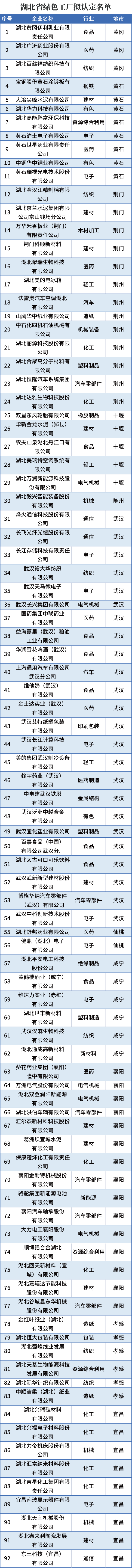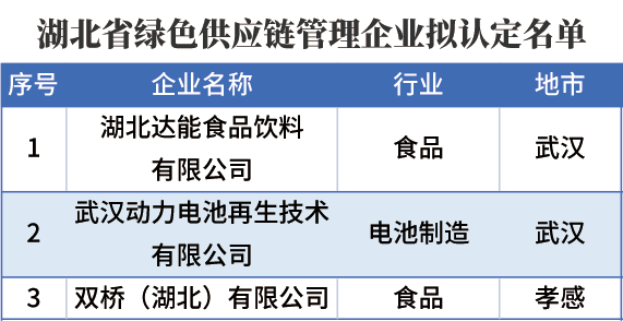 根据公示,烽火通信科技股份有限公司等24家在汉企业拟被认定为湖北省绿色工厂;湖北达能食品饮料有限公司、武汉动力电池再生技术有限公司这两家在汉企业拟被认定为湖北省绿色供应链管理企业。(见下图,排名不分先后)