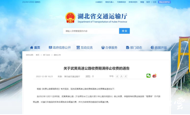 湖北广电融媒体新闻中心记者,今天(12月8号)从湖北省交通运输厅网站获悉:湖北首条收费期满免费通行的高速公路——武黄高速,将于12月11日零点起免费通行。