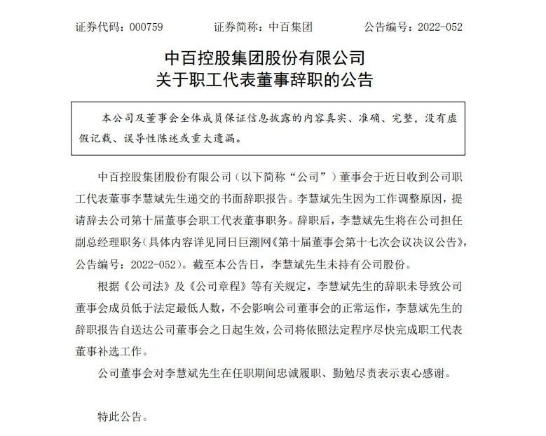 中百集团12月5日晚间发布公告称,李军先生因为工作变动原因,提请辞去公司第十届董事会董事、董事长及董事会战略委员会委员等职务。李军先生不再担任公司任何职务。截至本公告日,李军先生未持有公司股份。
