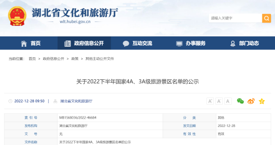12月28日,湖北省文化和旅游厅公示2022下半年国家4A、3A级旅游景区名单,拟新增国家4A级旅游景区8家,国家3A级旅游景区。