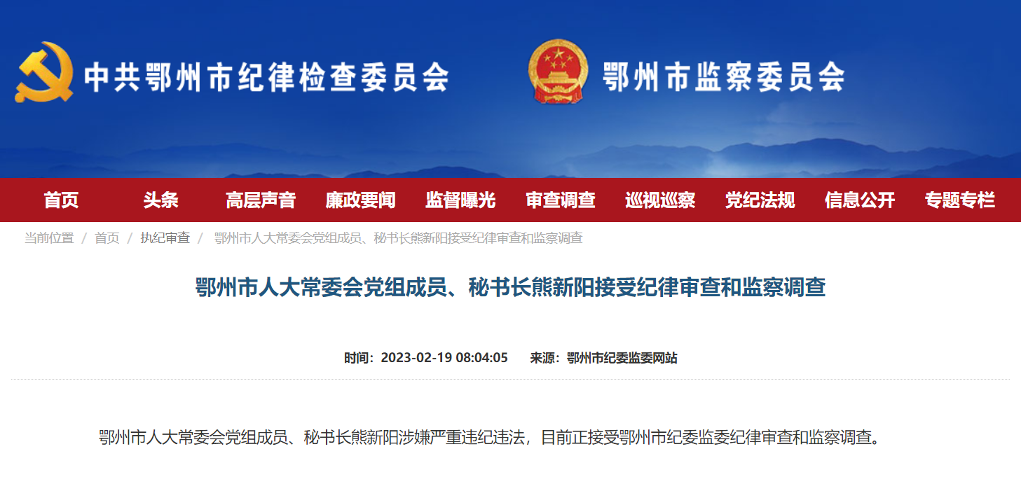 2月19日,湖北省鄂州市纪委监委官网发布消息称, 鄂州市人大常委会党组成员、秘书长熊新阳涉嫌严重违纪违法,目前正接受鄂州市纪委监委纪律审查和监察调查。