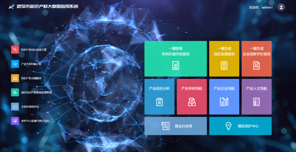 据介绍,系统提供了智能、便捷、高效的知识产权大数据决策工具,政府部门可实现对武汉市下辖各区、开发区“965”产业专利、企业、人才、资本等数据的统计分析、报告下载与可视化展示。
