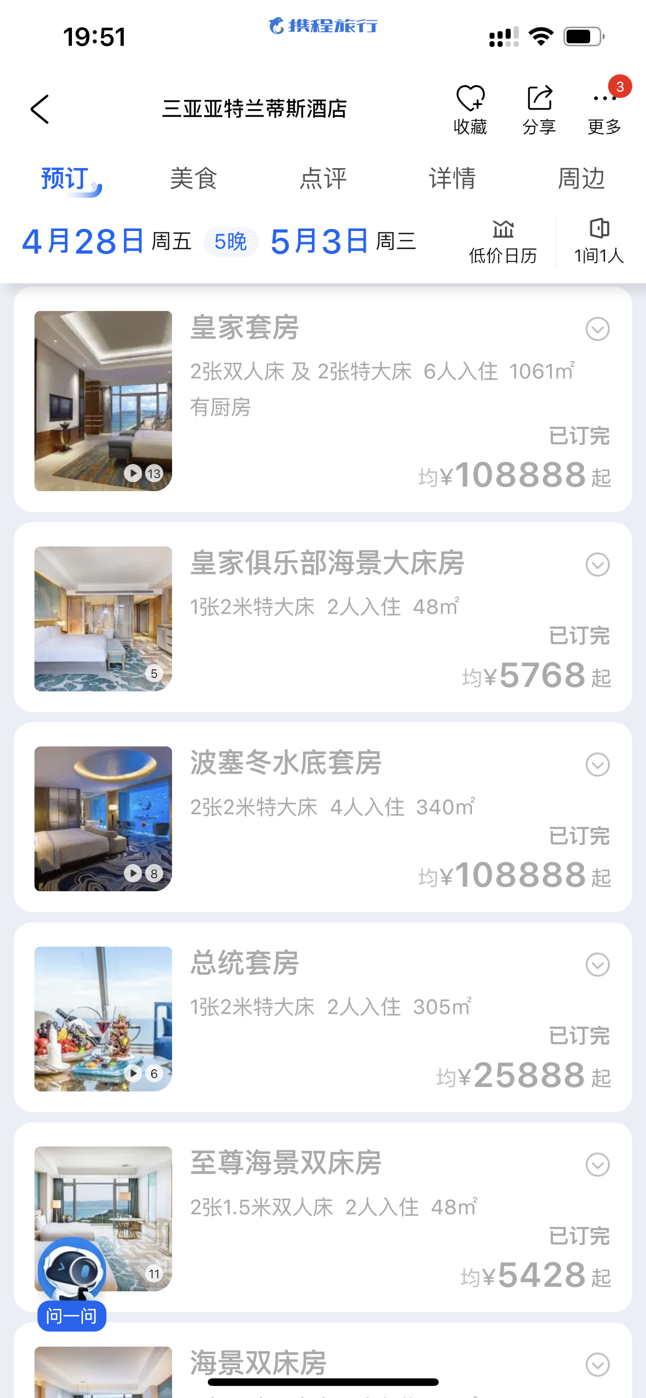 值得一提的是,澎湃新闻搜索发现,截至目前,三亚亚特兰蒂斯4月28日至5月3日入住的房型中,有10种房型已订满,其中包括108888元/晚的皇家套房和波塞冬水底套房,不过该两个户型的平日价格也为108888元/晚。