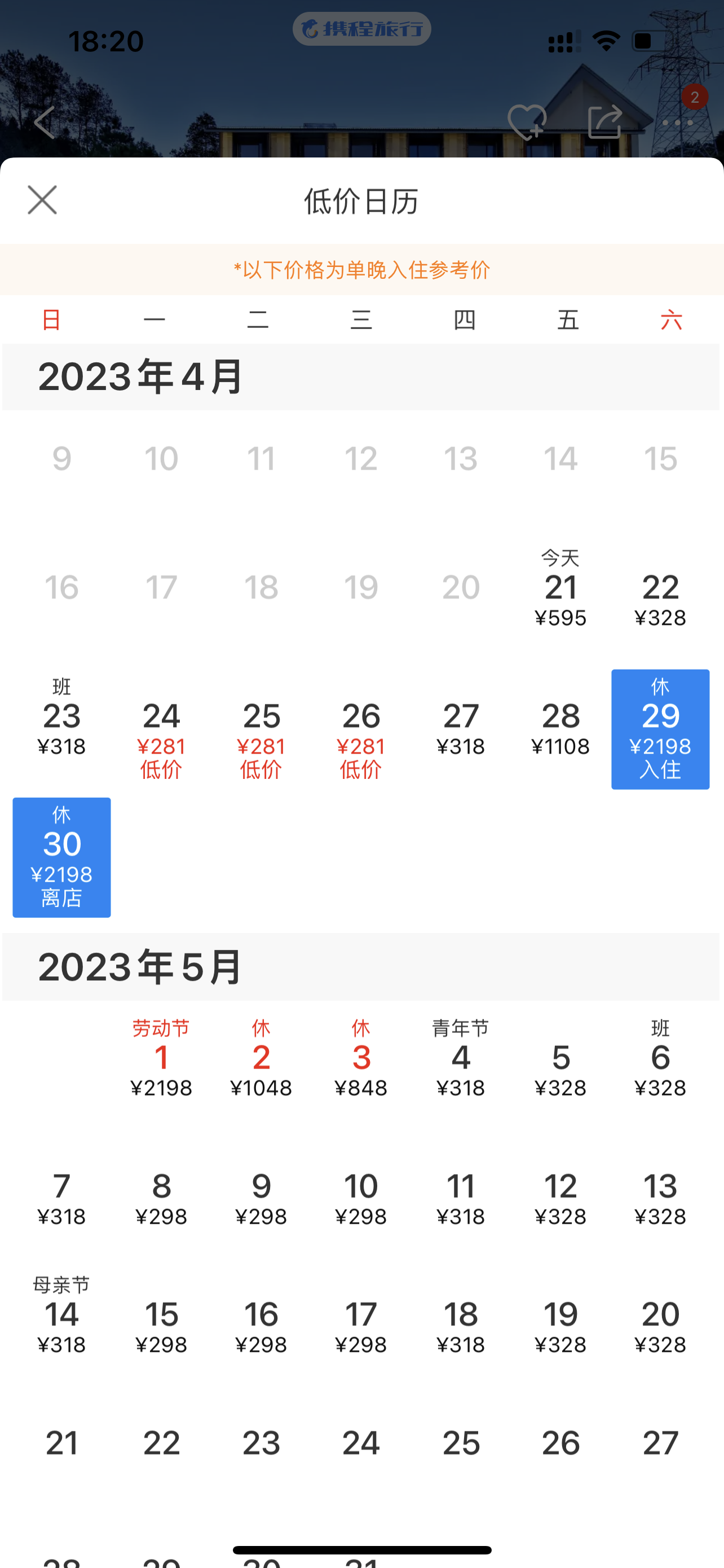 某位于景德镇的四钻酒店看起来“五一”假期和平日的价差更大。澎湃新闻搜索发现,该酒店4月、5月平日最低能订到300元/晚左右的房间,甚至“五一”前一周有房型的最低价300元不到,仅281元/晚,而4月29日至5月1日最低仅能订到2198元的房间。