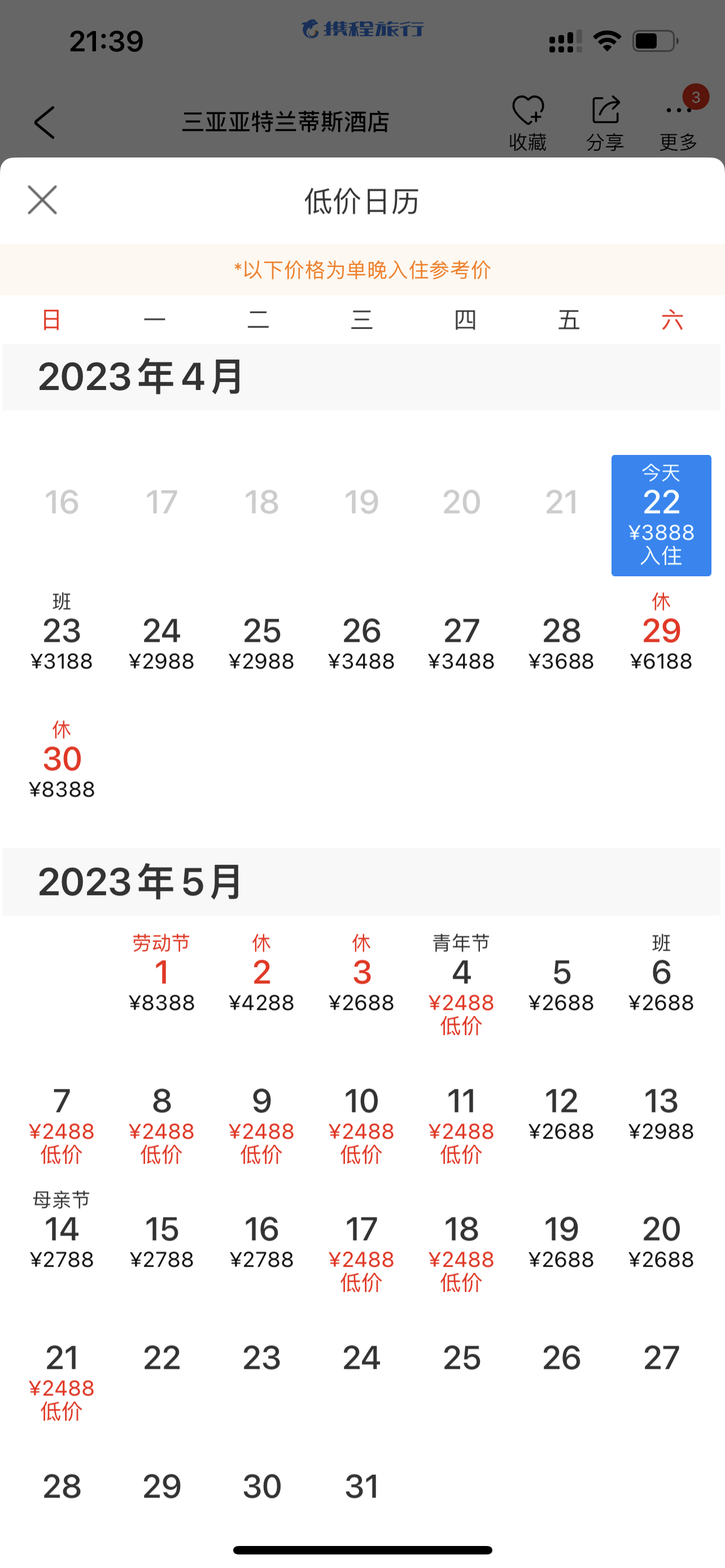 三亚亚特兰蒂斯酒店4月、5月平日最低房价为2488元/晚,目前4月29日能够入住的最低房价为6188元/晚,4月30日和5月1日的最低入住价格达8388元/晚。