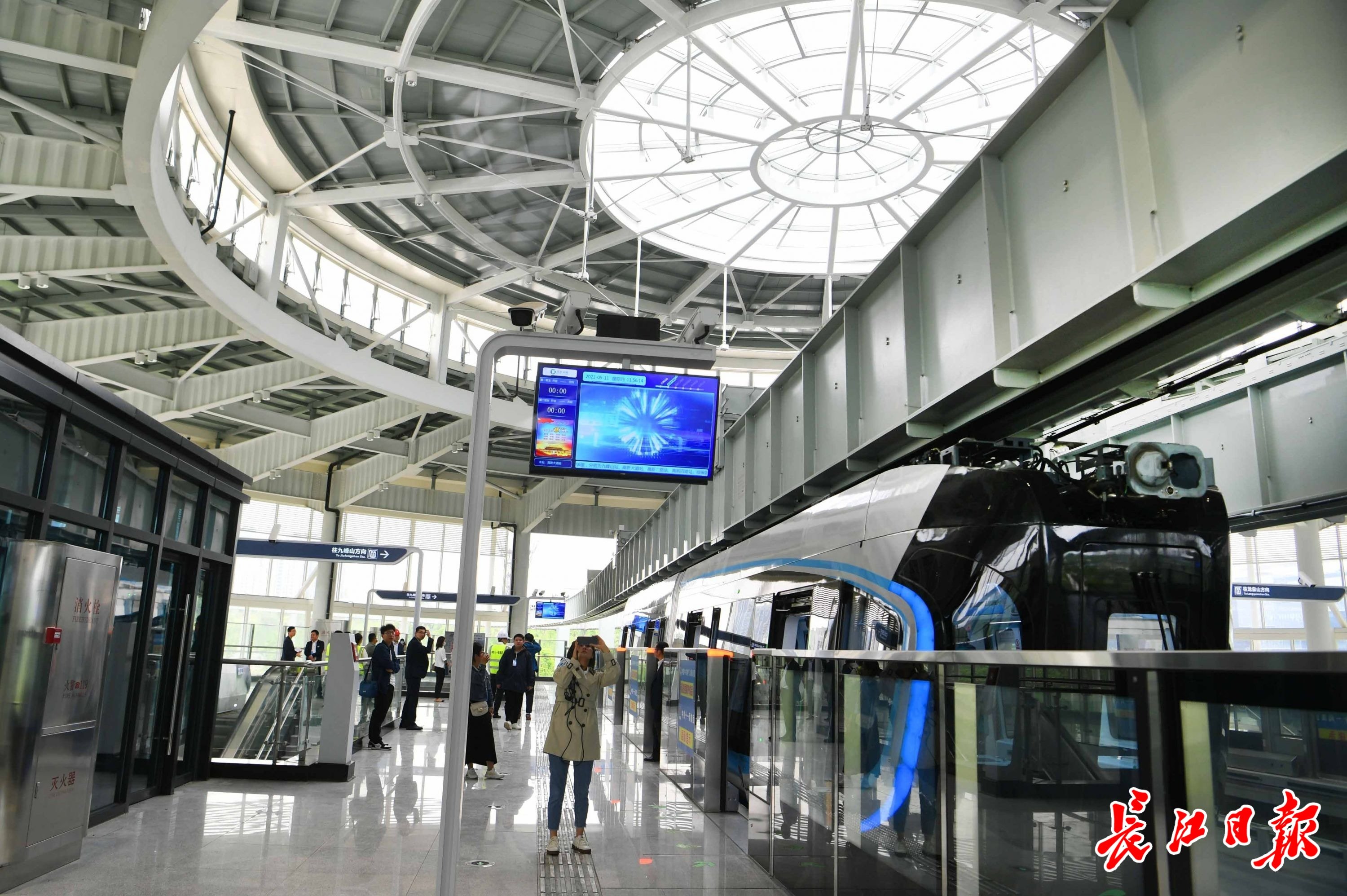 光谷空轨造型以“科技之翼”为创意主题,外观色带采用“科技蓝”,象征着光谷科技产业的蓬勃发展。列车实现智能感知、智能行车全过程自动控制,最高运行时速60km,初期采用2节编组,最多能容纳220余人。目前,光谷空轨先行启动的一期工程,线路全长约10.5km,设站6座,起于九峰山、止于龙泉山,途经高新大道站、高新二路站、高新四路站和综保区站。车站采用科技创新、绿色生态、荆楚文化的理念设计,一站一景,分别以“光谷之翼”“亭盖丛丛”“光谷云桥”“祥鱼争渡”“水帘成幕”“楚韵汉风”为主题,充分彰显光谷特色文化。届时,游客乘坐“光谷光子号”空轨可通过270°透明式观景窗,俯瞰光谷美景,在“空中流动风景线”上体验诗意生活。(长江日报记者高勇 摄影报道)