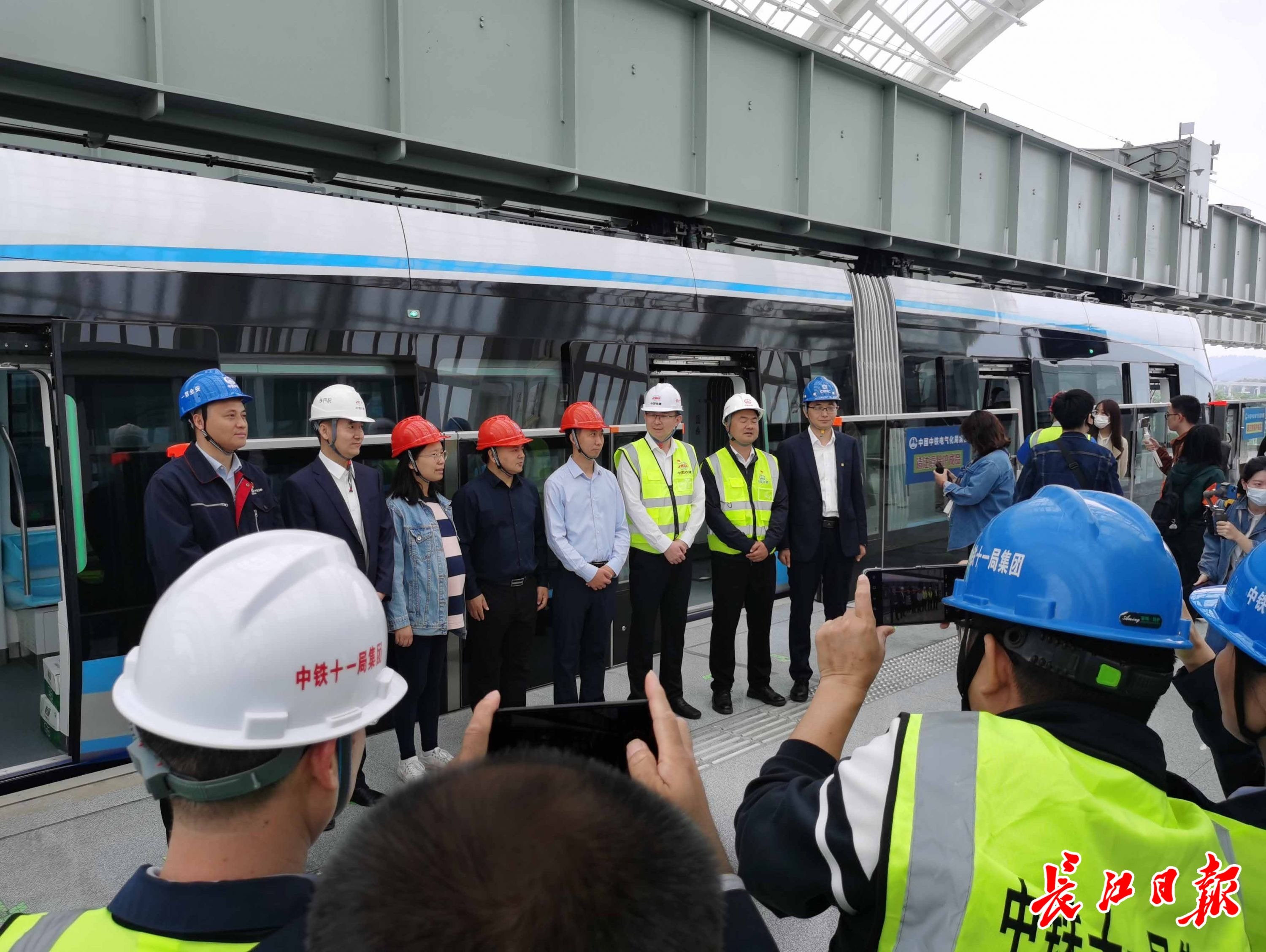 空轨建设者与“光谷光子号”合影。