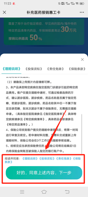 6.仔细阅读《理赔说明》《投保须知》《责任免除》《保险条款》后点击“好的,同意上述内容,下一步”提交。