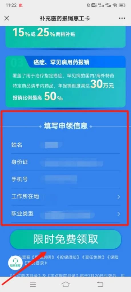 5.页面下滑至填写申领信息页面并按要求填写后点击“限时免费领取”。