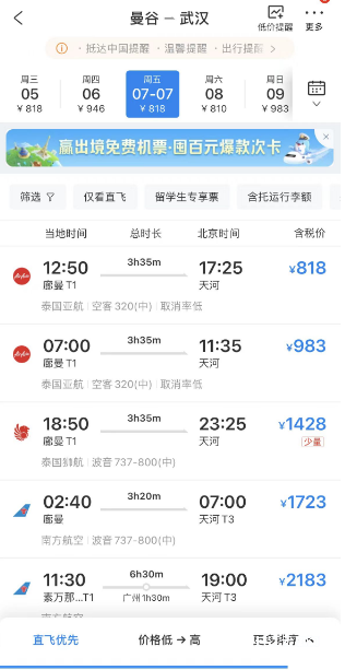 记者了解到,武汉直飞曼谷去程航班号为CZ5035,22:30从武汉天河国际机场起飞,次日01:10到达曼谷廊曼国际机场,回程航班号为CZ5036,02:40从曼谷起飞,早晨07:00到达武汉,目前航班已上系统开放销售。