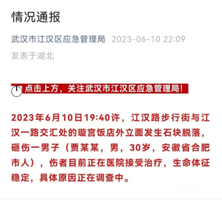 通报称,2023年6月10日19:40许,江汉路步行街与江汉一路交汇处的璇宫饭店外立面发生石块脱落,砸伤一男子(贾某某,男,30岁,安徽省合肥市人),伤者目前正在医院接受治疗,生命体征稳定,具体原因正在调查中。