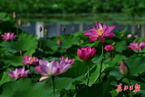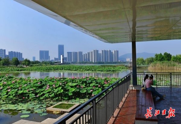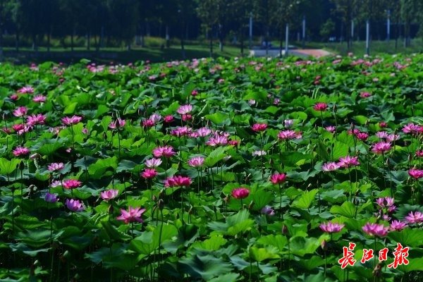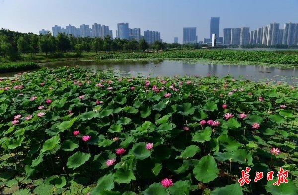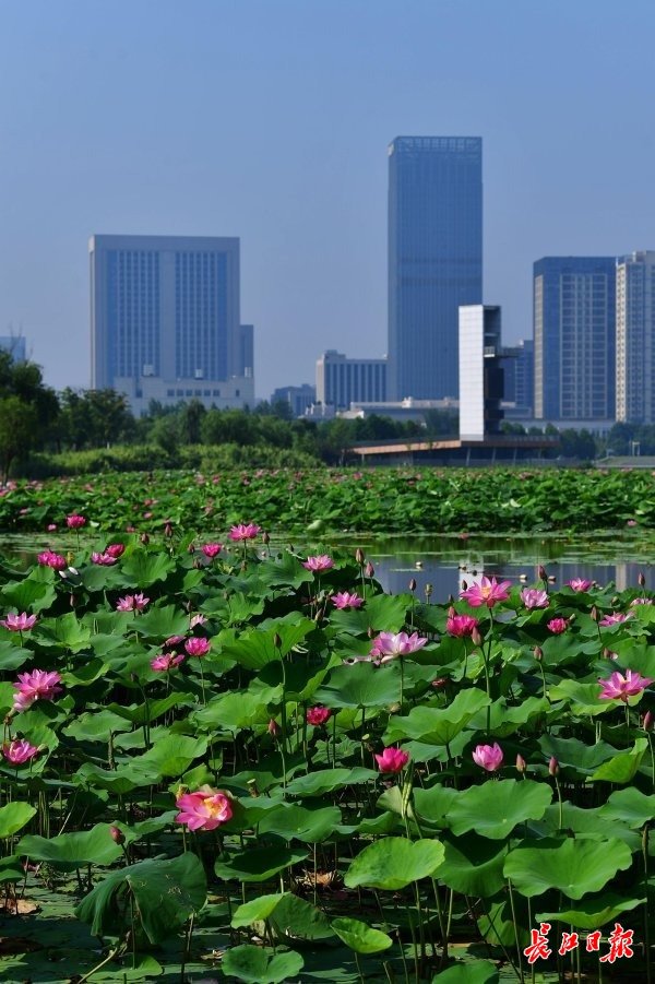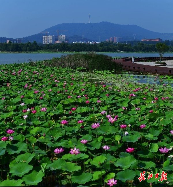 长江日报大武汉客户端6月11日讯 6月11日,武汉市江夏中央大公园曲折蜿蜒的湖岸边,连片的荷叶铺满一个个湖汊,朵朵粉红的荷花挺立在绿叶之上,正应了“接天莲叶无穷碧,映日荷花别样红”的诗句。深入湖中的栈桥、亭台,直抵荷花近处,游人可近距离赏荷。(长江日报记者李永刚 摄影报道)