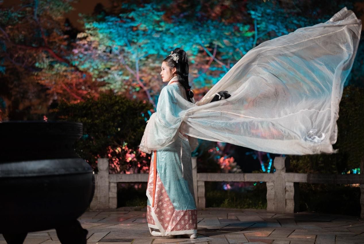 端午之夜,鹅池将重现伟大诗人的风采。池水如镜,映着流光溢彩,灯彩之间,“屈原”吟诵着《九歌》缓缓走出,仿佛走过了两千多年的旅程,举手投足尽显风雅,也抒发着悲天悯人的家国情怀。一对卖货郎夫妇跟随其后,满怀敬意地看着屈子行吟,鹅池的演员跳起舞蹈《采薇》,表达对诗人的无限缅怀。主楼的国潮舞狮,与鹅池的光影笔墨动静相照,灯会集市里,宛如黄鹤楼下浓缩版的户部巷、微缩版的《清明上河图》,各种民俗特色小吃汇聚,吆喝声此起彼伏,让游客沉浸在荆楚特色的人间烟火里,千年名楼将成为欢度传统节日的好去处。
