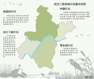 其中,有4个二级流域片区与武汉直接相关。府澴河片区的重点任务是,加强桐柏山、大别山水土流失综合治理和大洪山生物多样性保护。实施木兰山、将军山森林质量提升。实施府河、涢水、朱湖等湿地公园湿地保护与修复。加强生态公益林和天然林保护,优化陆生野生动植物生存环境。黄陂祁家湾青头潜鸭、府河柏泉段候鸟栖息地受到“重点关照”、直接提名保护。