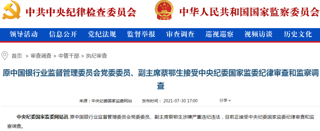 中央纪委国家监委网站中管干部审查调查栏目显示,2021年7月30日通报,原中国银行业监督管理委员会党委委员、副主席蔡鄂生涉嫌严重违纪违法,接受中央纪委国家监委纪律审查和监察调查。