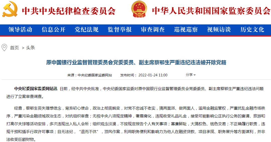 2022年1月24日,中央纪委国家监委网站发布信息,日前,经中共中央批准,中央纪委国家监委对原中国银行业监督管理委员会党委委员、副主席蔡鄂生严重违纪违法问题进行了立案审查调查。
