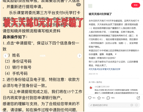 一位消费者反映,在“天天练”APP客服推送的广告链接消费498元参加“0元打卡”活动,家长和孩子兴致勃勃地坚持了299天,按照约定打卡完毕后申请提现,平台却提示审核未通过,要求用户绑定微信。同时,用户还得填写姓名、电话、银行卡等信息,并上传身份证正反面照片,还需要采集本人面部信息,签订一份推广协议。该用户质疑,广告链接中并未告知提现需要这么复杂的流程,而且自己的这些个人信息一旦泄露,后果不堪设想。