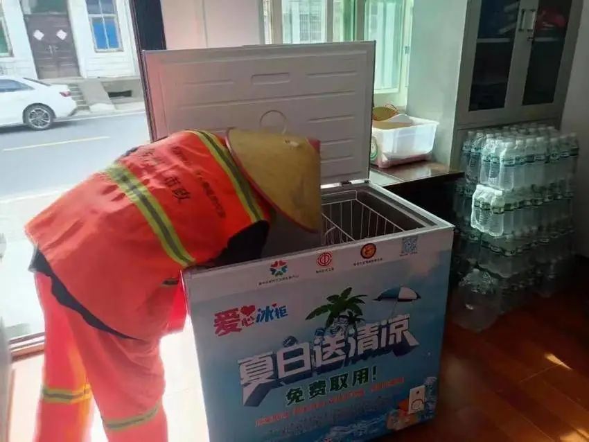 “我在这边上班,晓得这里可以免费喝水、休息。”7月14日,环卫工人罗师傅来到黄州区建新社区门口,熟练地从“爱心冰柜”里拿出一瓶矿泉水饮用。