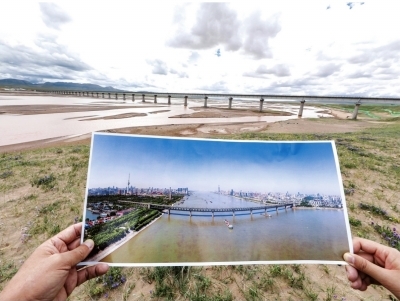 7月24日,探访团成员从武汉带去的武汉长江大桥照片,与长江源头第一桥青藏铁路长江源特大桥同框入镜。