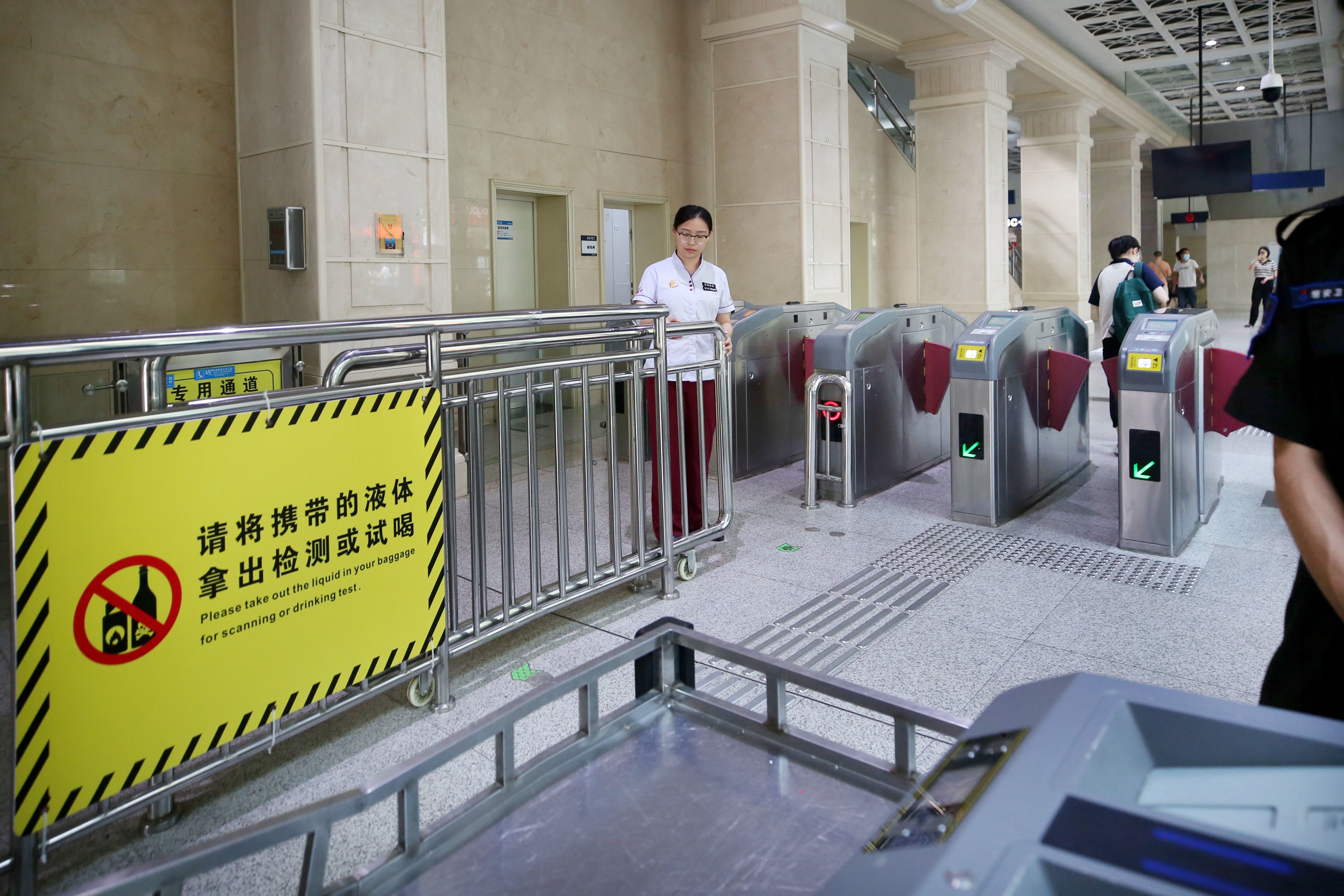 早上,1号线黄浦路站值班站长梅寒嫣拉开隔离活动栏杆,方便乘客出站。通讯员供图