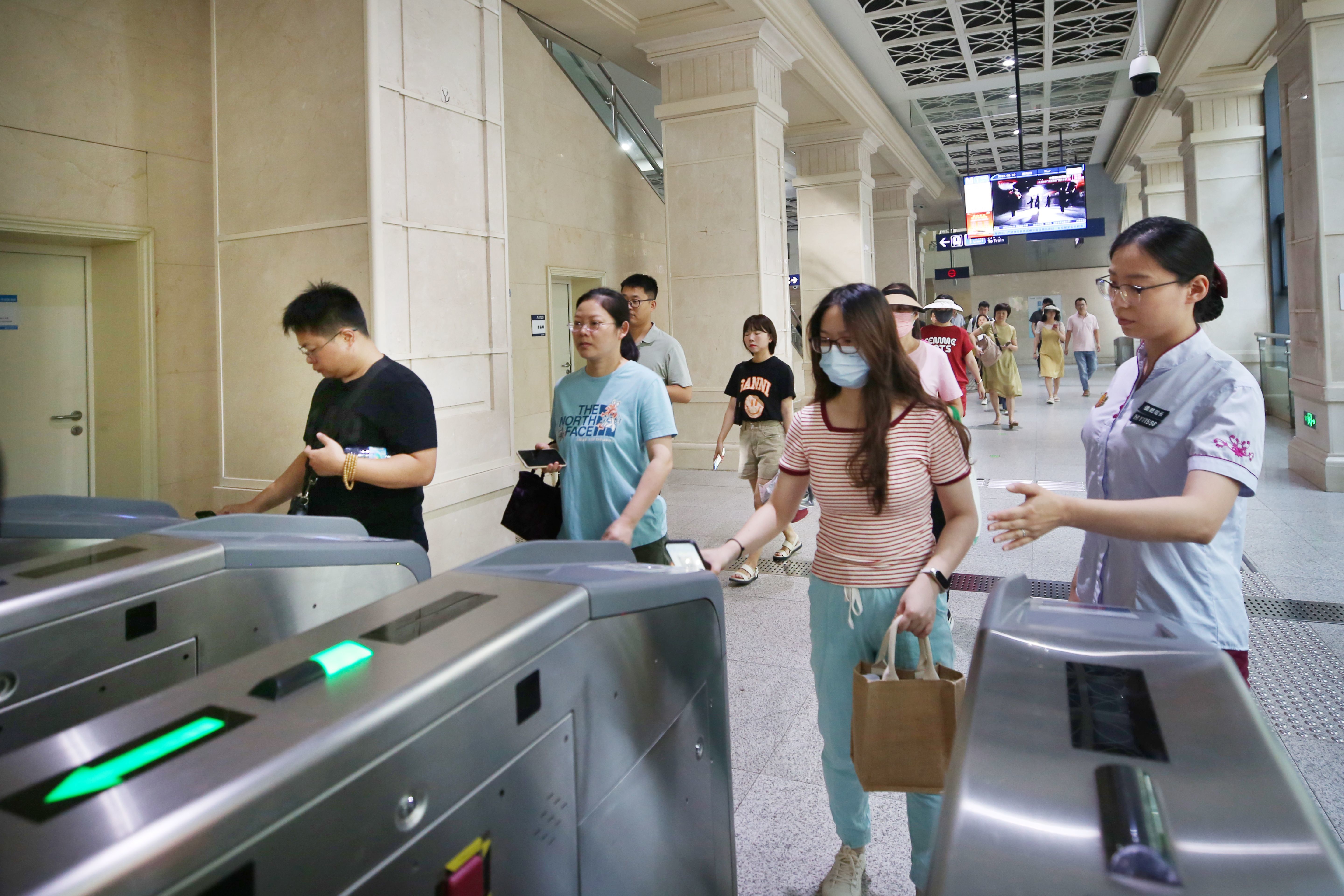 “您好!请往这边走,这边的两组闸机也可以出站。”8月17日早8时许,黄浦路站值班站长梅寒嫣在站厅B、C口通道处引导乘客从双向闸机快速出站。
