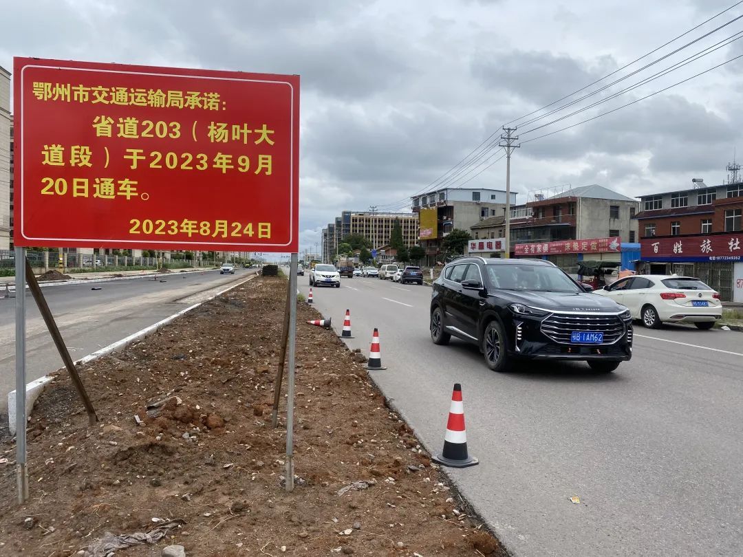 当日上午,记者在203省道鄂州与黄石的交界处看到,这里竖起了一个承诺牌:“省道203(杨叶大道段)于2023年9月20日通车。”落款是鄂州市交通运输局,落款日期为2023年8月24日。在省道203(杨叶大道段)施工建设现场一片忙碌,该路段将按迎宾大道标准建设。