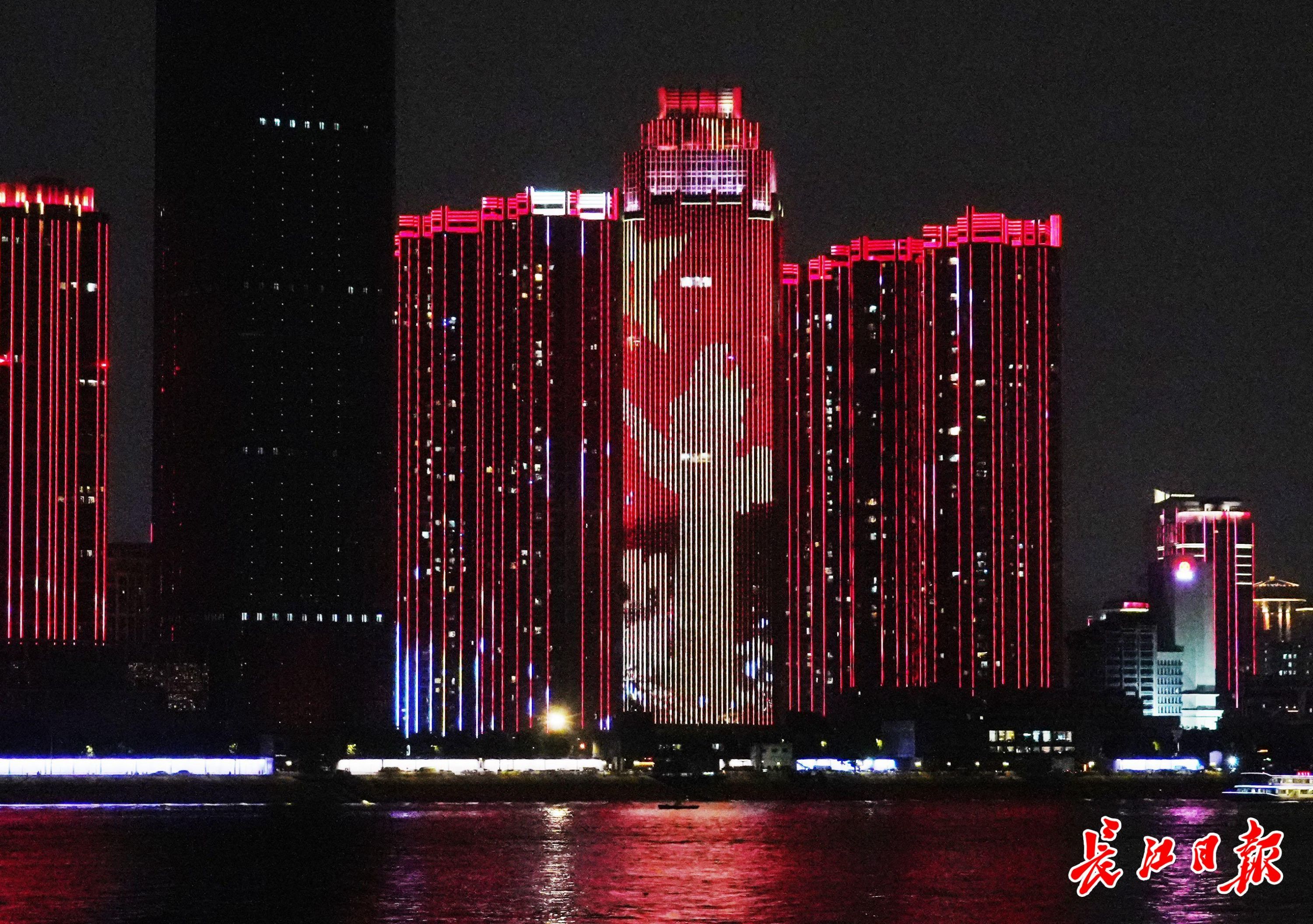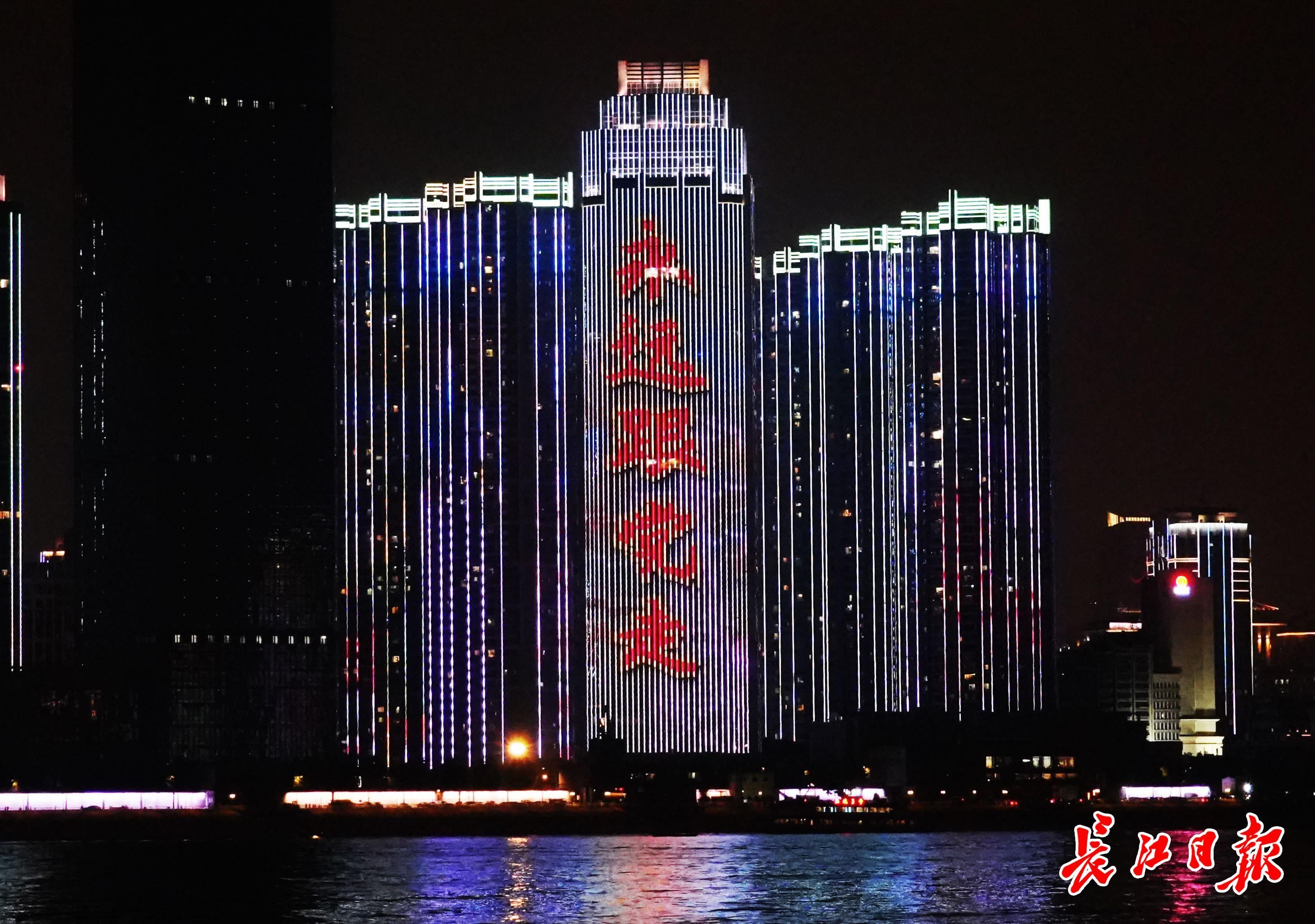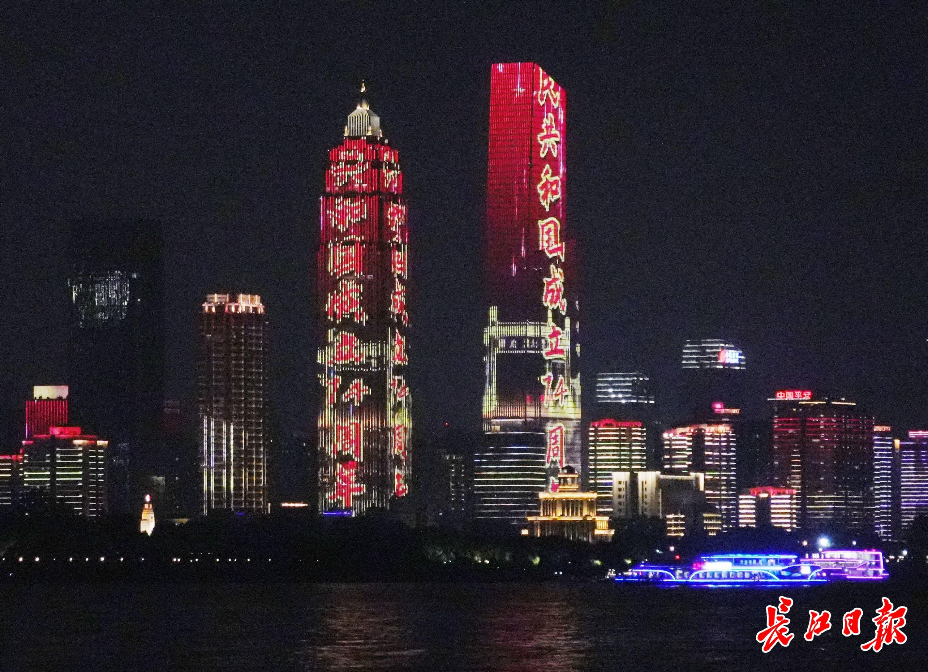 长江日报大武汉客户端10月1日讯 10月1日晚,长江灯光秀献礼建国74周年特辑,在两江四岸沿江楼宇上演。(长江日报记者何晓刚 摄影报道)