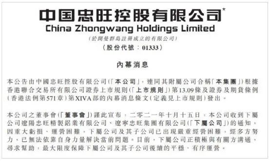 在王大伟被查之前,2021年10月15日,中国忠旺收到下属公司辽宁忠旺集团有限公司的通知,因重大亏损、运营困难,下属公司及其子公司已出现严重经营困难,经多方努力,已无法依靠自身力量解决当前问题。