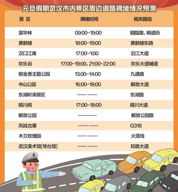 商圈方面,武广、江汉路、万象城、梦时代、万科未来中心、汉正街、黄陂奥特莱斯、王家湾商圈、武汉天地、龙湖白沙天街、沌口永旺、江夏永旺等热门商圈,元旦期间人流量将保持高位运行,拥堵延时指数可能将超过3.0(严重拥堵),周边道路拥堵时间主要集中在11时至21时。