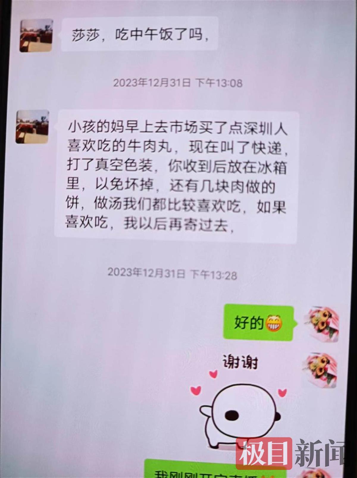 李莎说,虽然还没见到父母,但她已经感受到了来自他们的关爱。去年12月31日下午,母亲给她寄了广东的特色牛肉丸和牛肉饼,父亲叮嘱她肉丸和肉饼要放在冰箱里,还问她家里有没有冰箱,如果没有他就在网上订购一台送到家里。