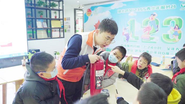 “小朋友,你们知道应该如何正确拨打119报警电话吗?”“那灭火器又该怎么使用呢?”1月29日上午,在武汉市青少年宫湖北武汉12355青少年服务台(以下简称12355服务台)内,一场消防安全课程正在开讲。