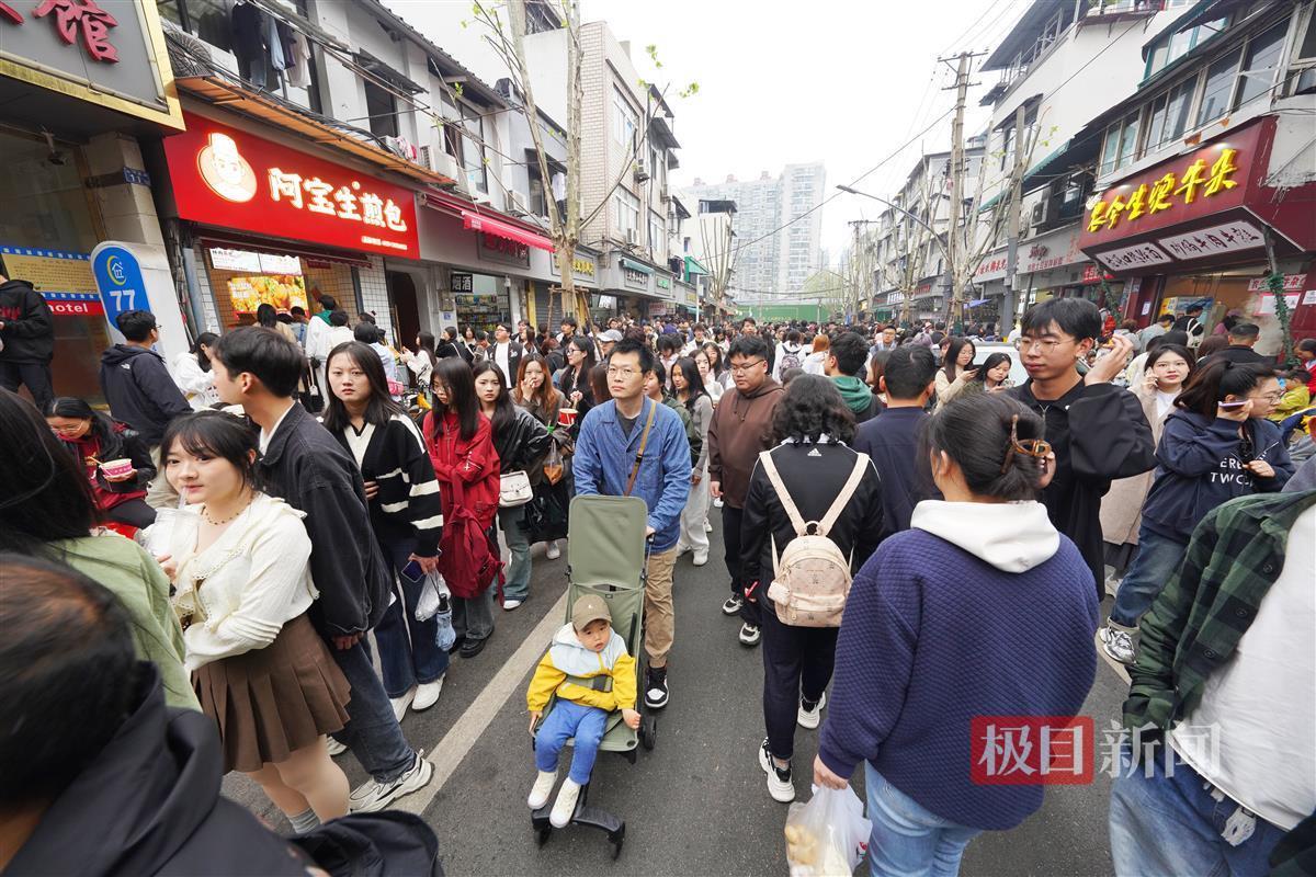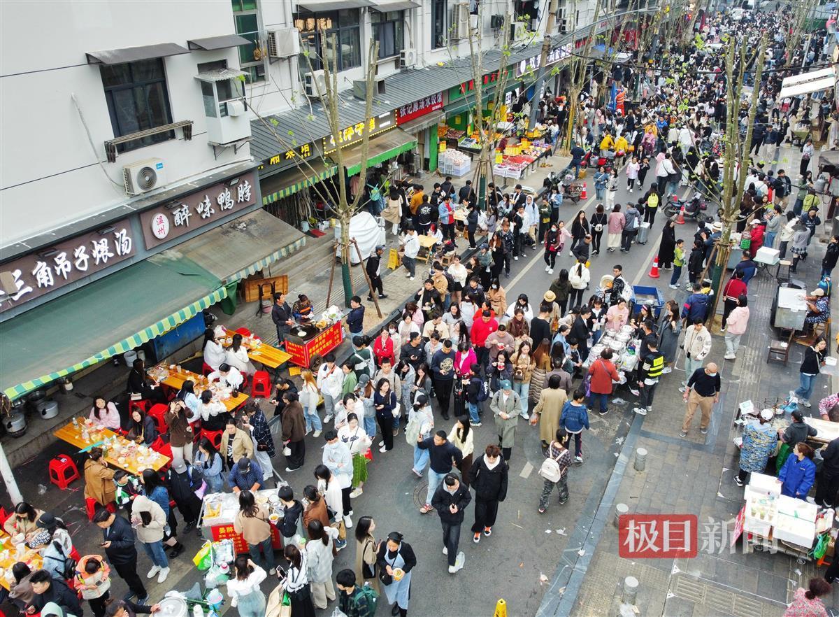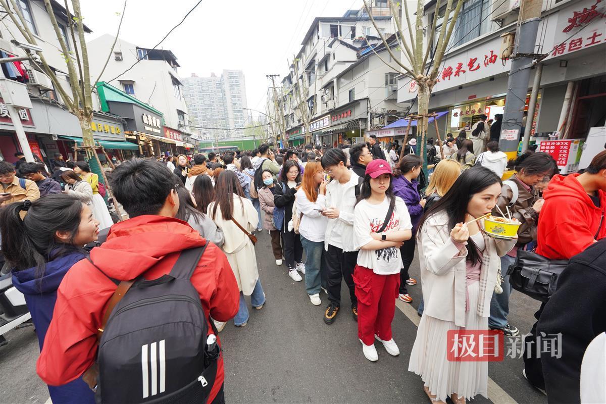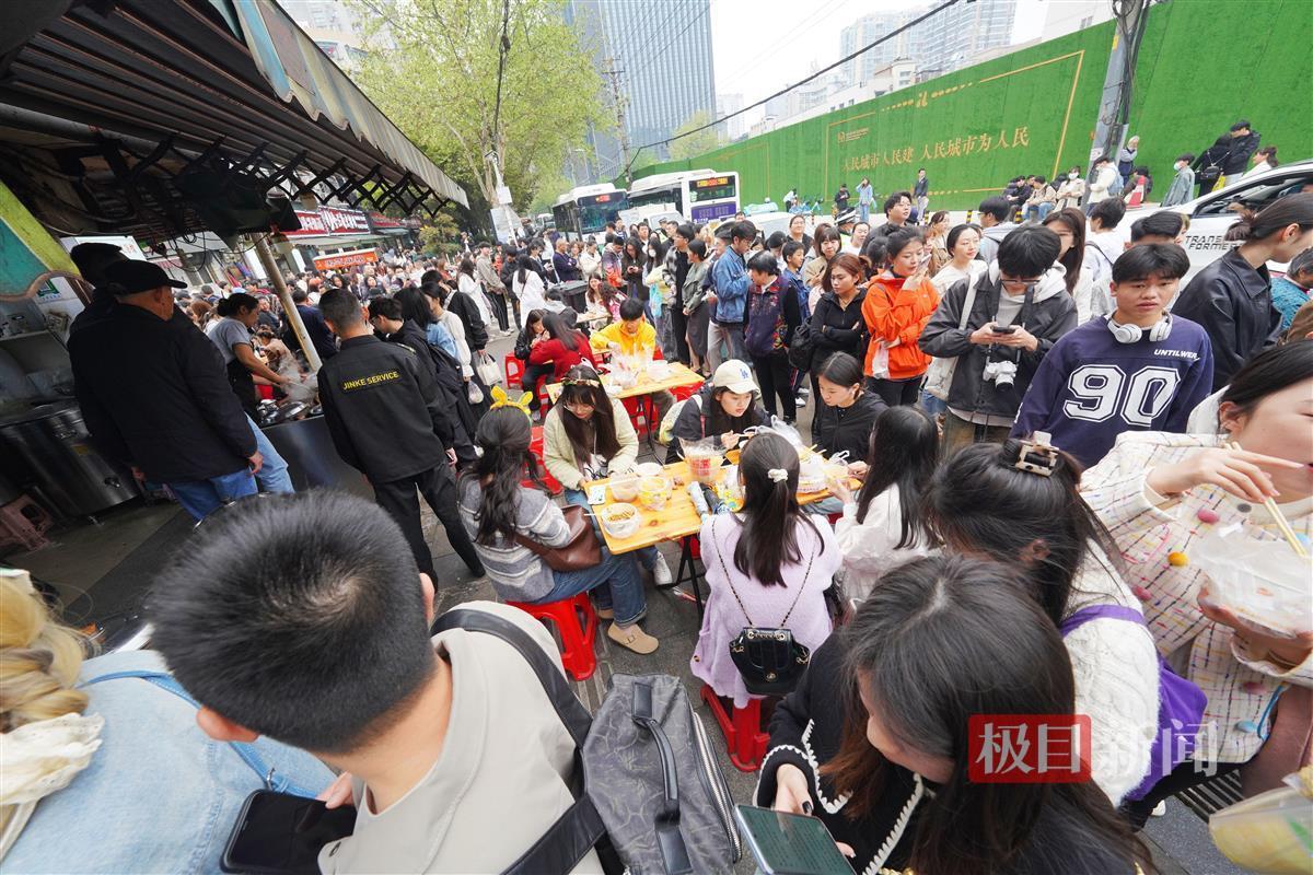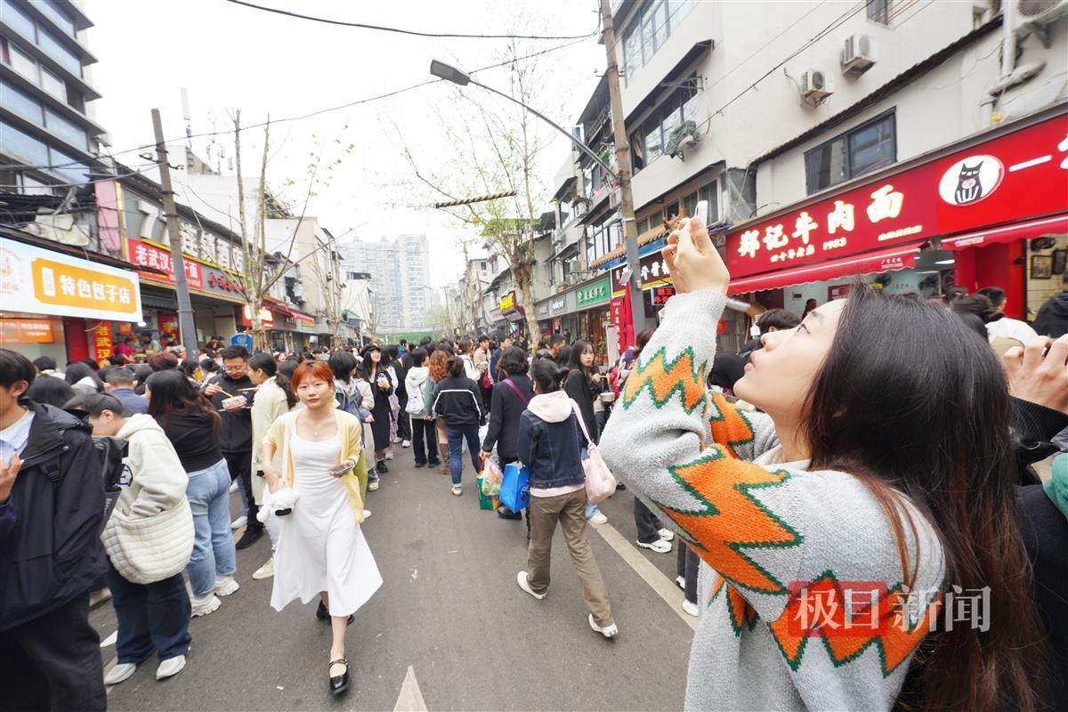 4月4日,早上8时,许多游客已经抵达武汉山海关路开启“过早”之旅。山海关路被誉为“碳水爱好者”的快乐老家,短短百来米全是好吃的早点:糯米包、油条、豆皮、鸡冠饺、吊子煨汤、牛肉面等各家商户前排起长队,人群摩肩接踵,许多游客是边吃边排队。