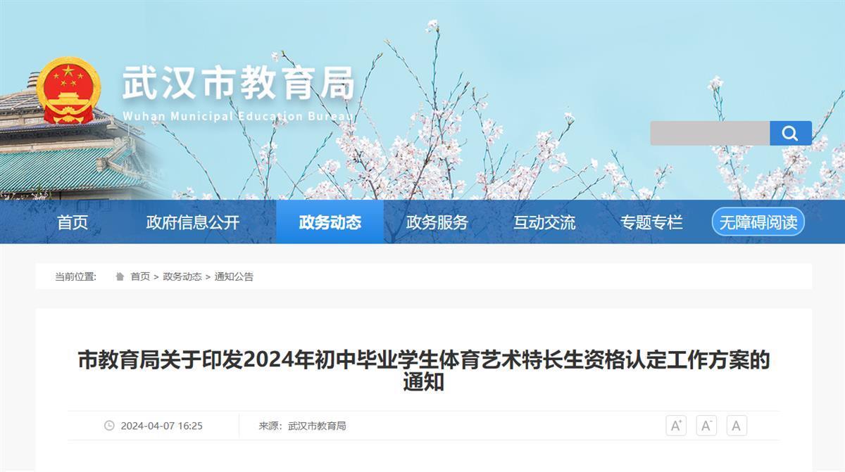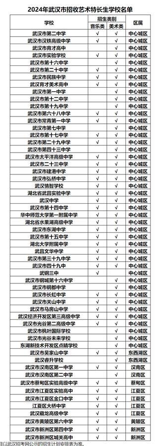 4月7日,武汉市教育局官网发布关于印发2024年初中毕业学生体育艺术特长生资格认定工作方案的通知。2024年武汉市有27所普通高中招收体育特长生,有56所普通高中招收艺术特长生。