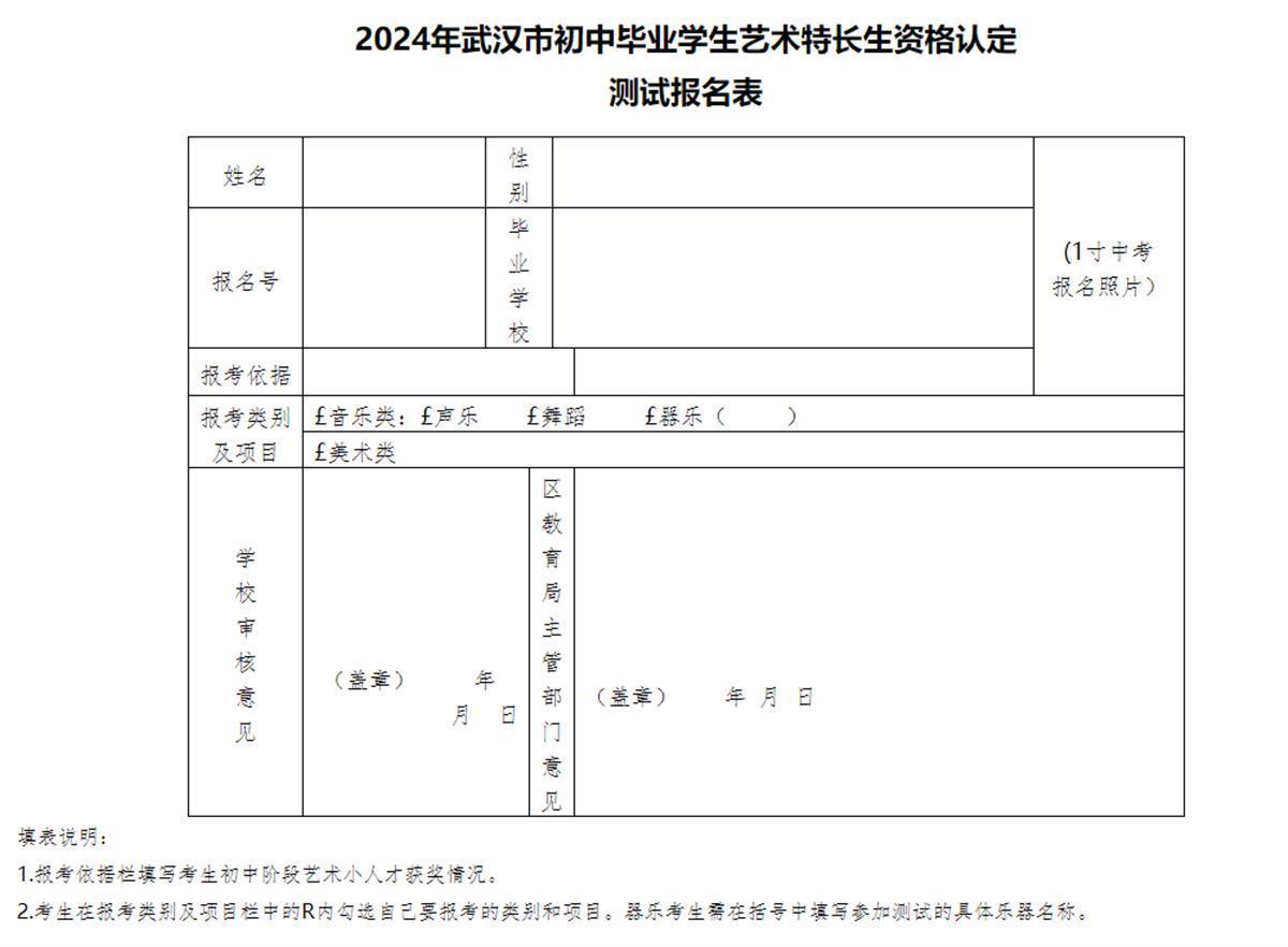 2024年武汉市初中毕业学生艺术特长生资格认定测试报名表